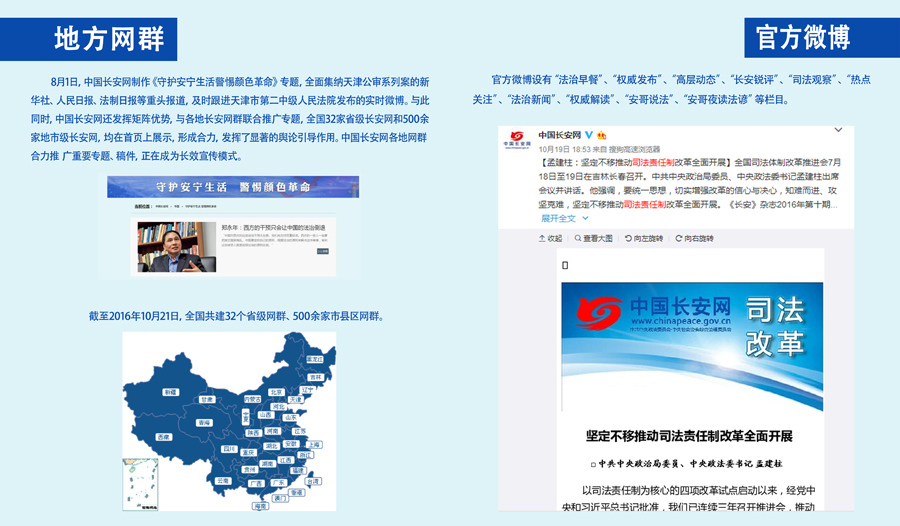 评选机构认为,中国长安网新版于2016年9月19日正式上线,10月25日,中国长安网移动客户端和官微相继开通,官微上线三个月粉丝数就达130万,是初始阶段增长最快的政务微博之一。中国长安网通过PC端、移动端和官微三位一体的横向覆盖,形成了纵向连接全国32家省级长安网和2000余家市县区级长安网的立体网络矩阵。中国长安网还通过搭建政法综治政务信息的发布平台,政法媒体新闻报道的集纳平台,政法系统新媒体作品的分享平台,政法干警网上文化生活的展示平台和政法系统联系群众的服务平台等“五大平台”,推动实现“四个服务”即服务于党和国家大局,服务于中央政法单位,服务于全国政法系统和干警,服务于广大网民,为中央深入推进社会治安综合治理创新工作作出了重要贡献。