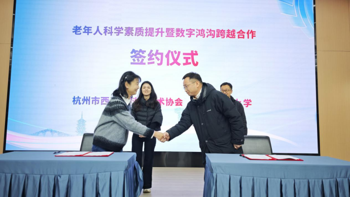 为推动老年人科学素质提升,现场西湖区科学技术协会与杭州社区大学共同签署了老年人科学素质提升暨数字鸿沟跨越合作协议。双方未来将进一步整合资源,通过课程开发、场地共享、培训赋能等多元化合作形式,为老年人搭建便捷、实用的学习平台。