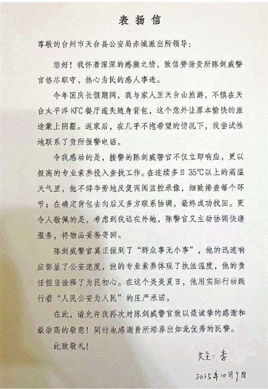 近日,台州市天台县公安局赤城派出所通过信访平台,收到一封特别的信件——来自上海李女士的表扬信。信中,她并非投诉或求助,而是请求表扬该所辅警陈剑威,感谢他帮忙找回一个“不值钱却意义非凡”的背包。