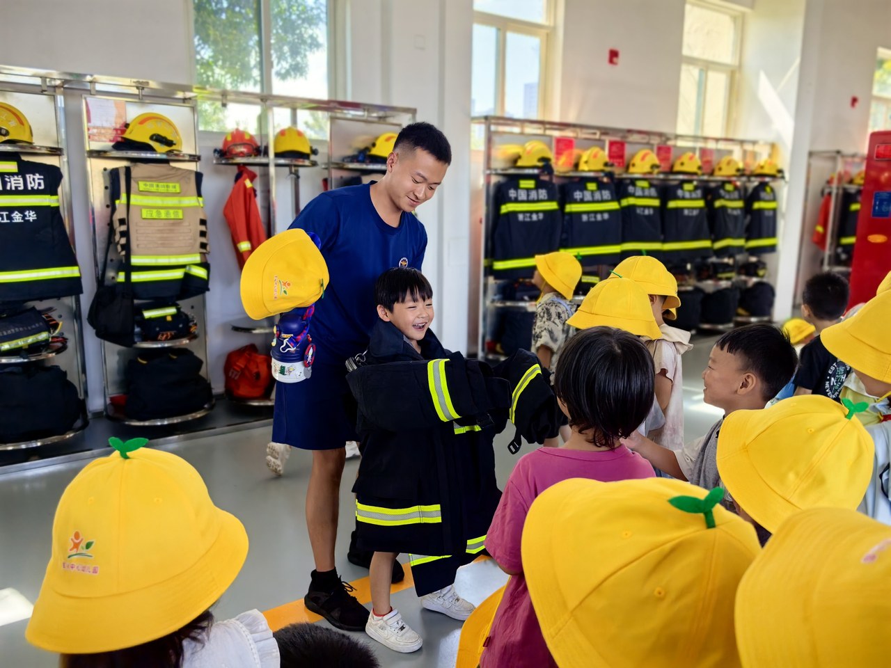近日,金华市金东区孝顺镇金义中心幼儿园的200余名萌娃在老师带领下,走进金东区金山大道消防救援站,零距离接触消防、体验消防。