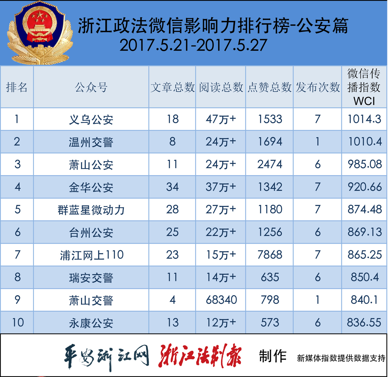 本期公安榜,“义乌公安”的阅读总数高达47万+,比上一期翻一番,以绝对优势夺下冠军。“温州交警”“萧山公安”发挥稳定,分获亚军和季军。