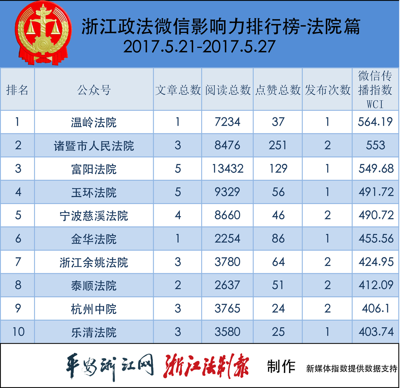 本期法院榜,“温岭法院”排名第一。老将“诸暨市人民法院”与“富阳法院”都比上期落后一名,分别排名第二、第三。