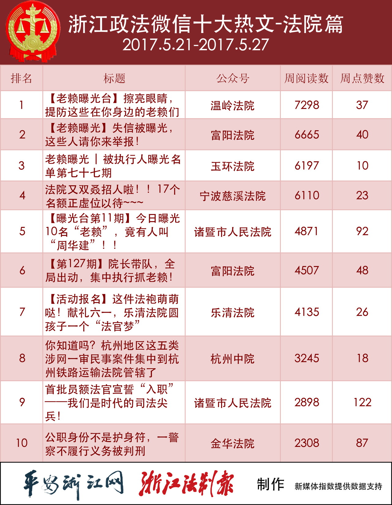 热文榜上,老生常谈“老赖”话题统领前三。“温岭法院”“富阳法院”和“玉环法院”的3篇《老赖曝光……》文章分别斩获冠亚季军。小编发现,助力“温岭法院”夺冠的“神器”就是这篇文章。事实上,“温岭法院”这一周只推送了这一篇文章。看来,“量少质高”也是条路子。