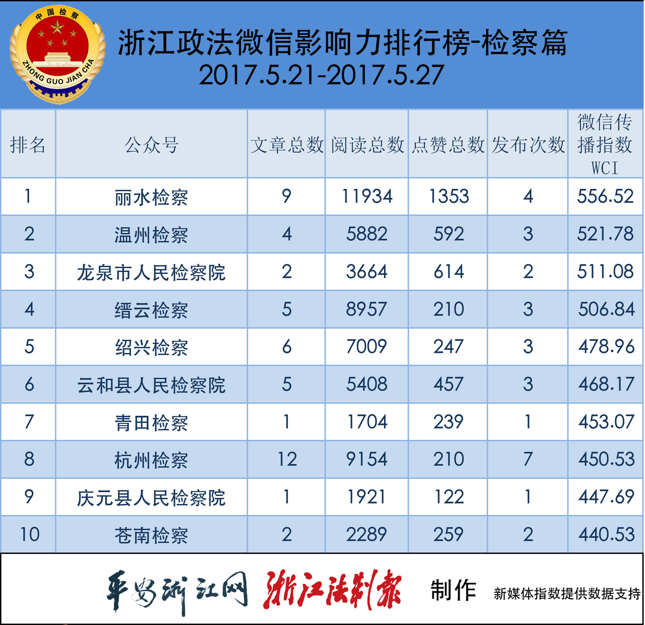 检察院榜,“丽水检察”从上期第5名一跃登上榜首。“温州检察”滑落一名,排名第二。“龙泉市人民检察院”挤进前三,拿下季军。