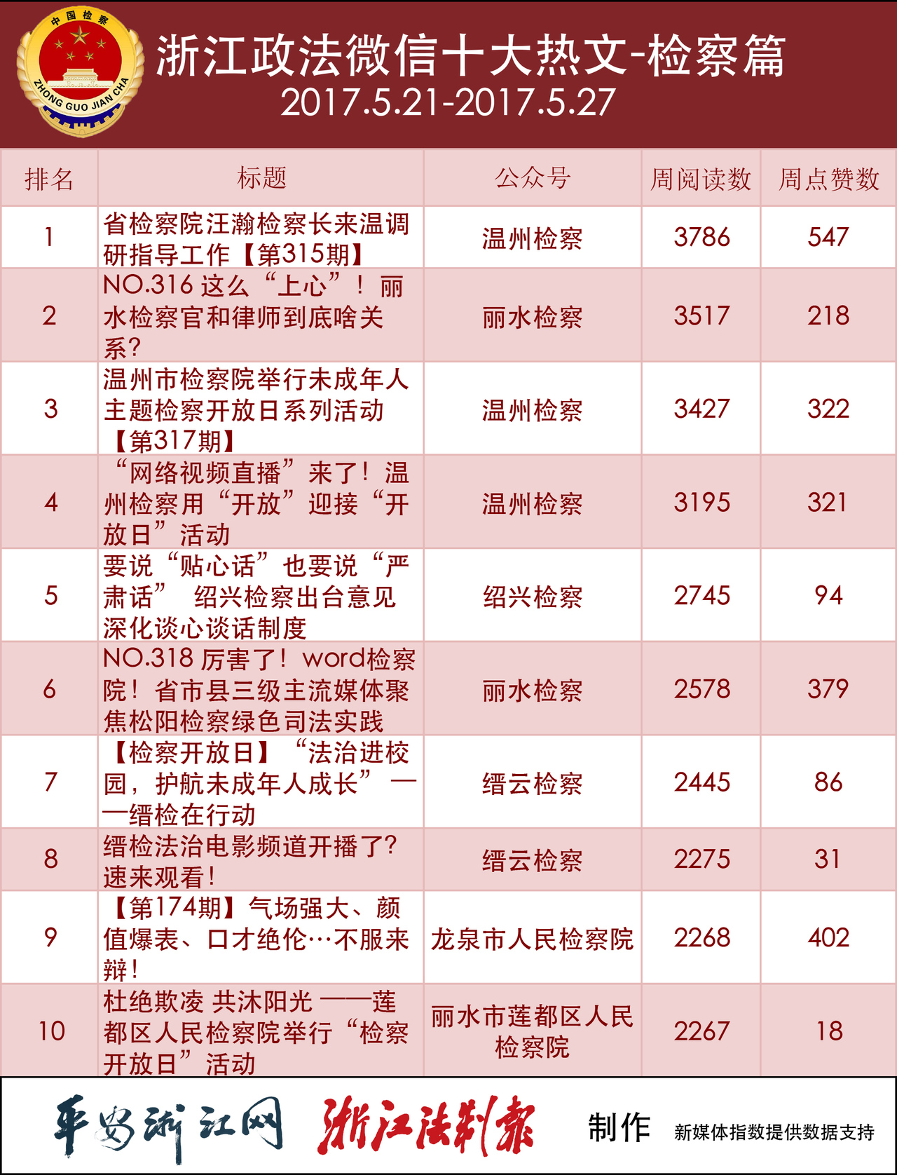 再看热文榜,“温州检察”的2篇工作信息分别列于第一、第三。“丽水检察”的《NO.316 这么“上心”!丽水检察官和律师到底啥关系?》夹在中间。虽说检察院公号发布的文章都以工作信息为主,但总有一些公号能另辟蹊径,将枯燥的信息变得有趣。