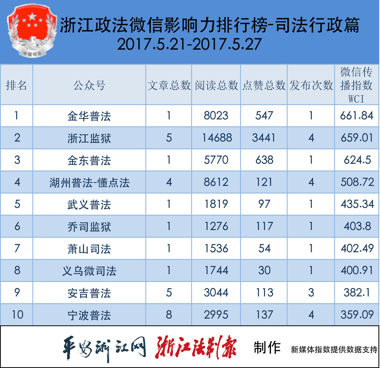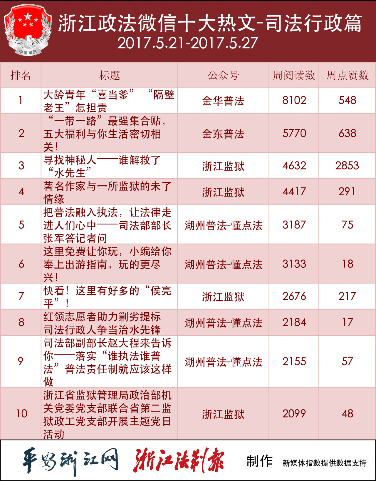 浙江政法微信影响力排行榜和浙江政法微信十大热文榜完整榜单,可扫二维码查看。