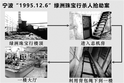 1995年12月6日凌晨,宁波绿洲珠宝行,案犯借助外墙电缆线和空调外挂机,爬到绿洲珠宝行6楼总机房内,再沿电梯井道下滑至1楼营业大厅。两名保安正在巡逻。案犯悄悄走近他们,将他们制服,并捆绑手脚。随后,他用工具撬开大厅内的4只保险箱,劫走价值160余万元的黄、白金饰品(重约11公斤)。临走时,他用手枪将两名保安打死。现场遗留一副自制消声器、一根自制四节撬棍、一把骨柄匕首和一捆军用背包绳、一副橡胶绝缘手套。