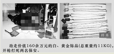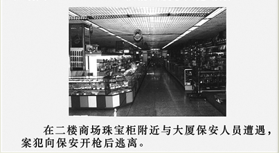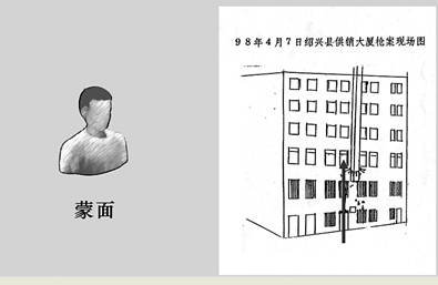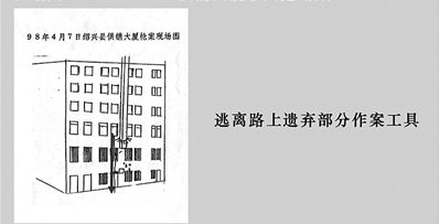 1998年4月7日晚,绍兴市供销大厦,案犯从3楼爬进大楼,潜到2楼黄金饰品柜附近时,被值班保安发现。案犯用手枪打伤保安,沿原路返回3楼,沿事先预留的绳索逃跑。现场遗留了一顶老头帽、一副自制消声器和一个自制手雷。