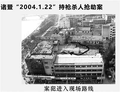 2004年1月22日凌晨(大年夜),诸暨第一百货商店,案犯爬入诸暨第一百货商店3楼,潜至2楼服饰商场附近时,被值班保安发现。他用刀、枪将保安打伤后,沿原路逃跑。现场遗留一根六角撬棍。