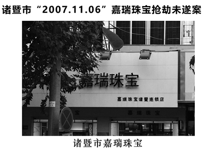 2007年11月,诸暨嘉瑞珠宝连锁店,案犯在进行抢劫时失手,随后逃离。但案犯此前曾多次踩点,其中一次被监控拍下。从监控上看,他上身穿一件黑色内衣,外面披了件黄色外套,下穿一条浅色牛仔裤,穿黑色运动鞋。