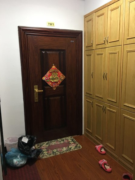 徐某的房子在七楼,独门独户,两部电梯可以直达,大门上贴了个“福”字。记者敲了几次门,都没有人回应。门口有几双鞋子、一个垃圾桶、一袋厨房垃圾以及几个快递包裹的外包装,垃圾桶里有几双警方刑事勘查时常用的白手套。
